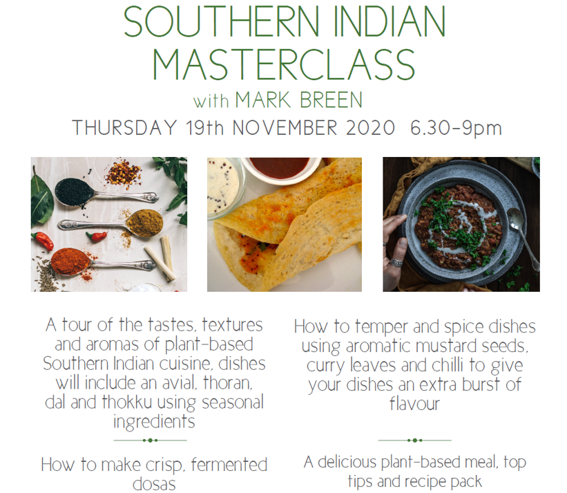 Fee*: £71 (£59 Concession*) includes a delicious Southern Indian plant-based meal and Recipe pack. Price includes VAT.